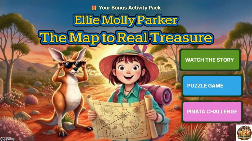 Join Ellie Molly Parker on an Australian outback adventure! This interactive activity pack transforms storytelling into an immersive experience. Watch the 15-minute narrated ‘The Map to Real Treasure’ story, then dive into the fun with themed puzzles and the Pinata Challenge.